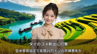 タイ国際外交・貿易 タイのコメ輸出に打撃 ~日米貿易協定で年間20万トンの市場喪失か 2025年7月の日米貿易協定により、タイの対日コメ輸出枠が30万トンから10万トン未満に縮小する見込み。年間1億4,000万米ドルの収益損失が予想され、日本が自動車産業保護のためコメ市場を譲歩した背景と、タイ業界への影響、今後の対応策を詳しく解説。 2025.10.19 タイ国際外交・貿易