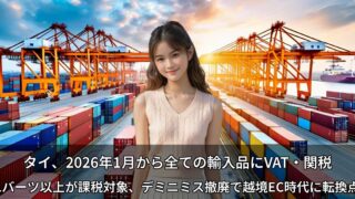 2025年12月16日、タイ政府が閣議で全輸入品へのVAT・関税課税を決定。2026年1月1日から1バーツ以上の輸入品すべてが課税対象に。デミニミス・ルール完全撤廃により越境EC市場に転換点。国内SME保護と年間30億バーツ増収を目指す政策の詳細、物流・プラットフォームへの影響、企業の対応策を詳しく解説。